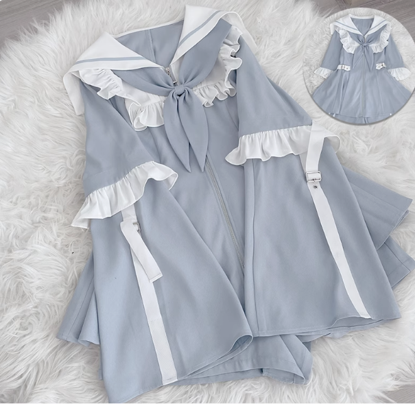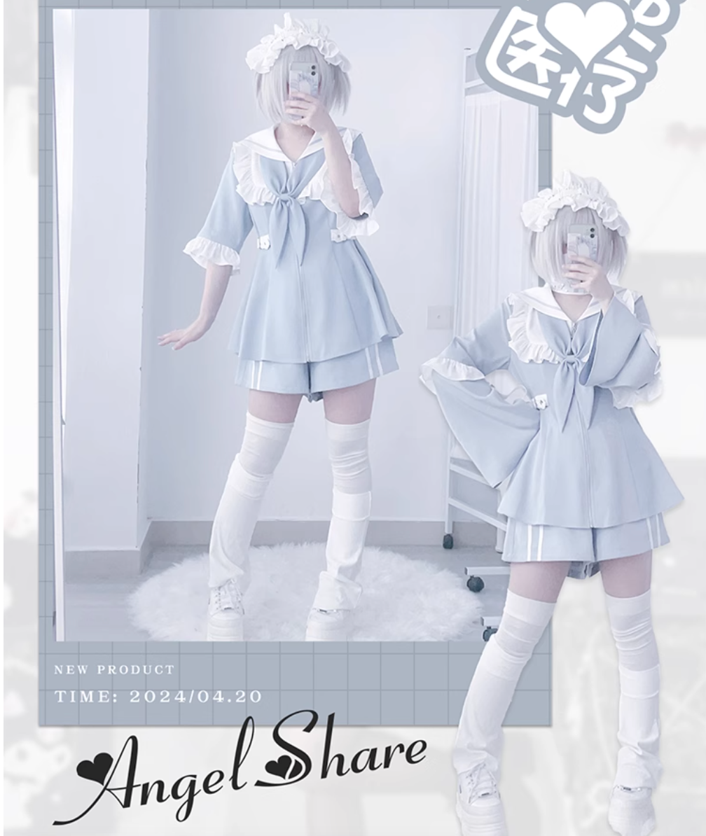 Sailor collar hoodie top and shorts set. Can be worn in two ways, long sleeves or short sleeves.