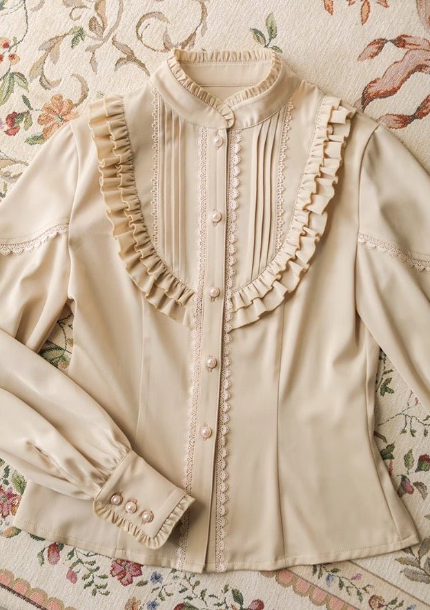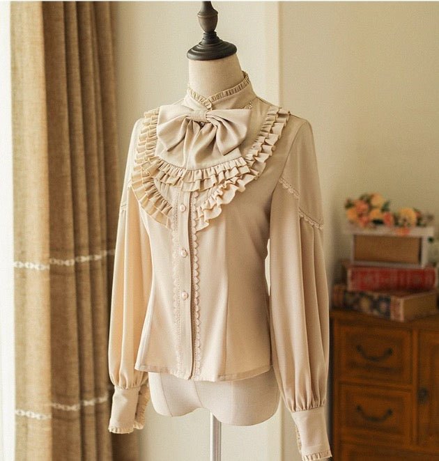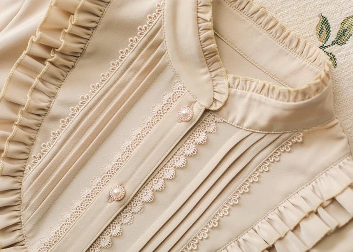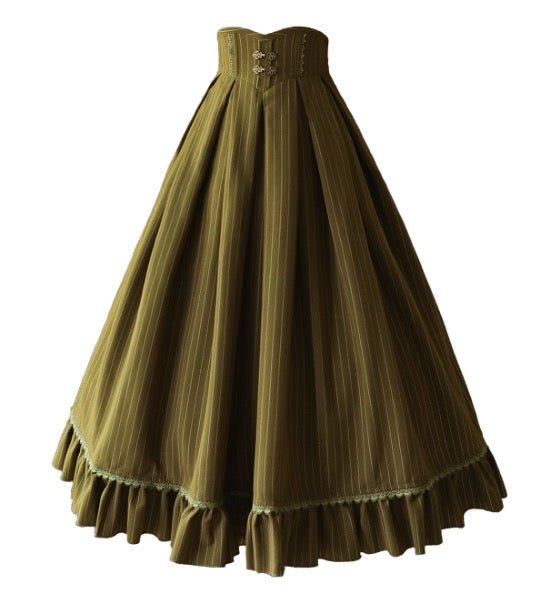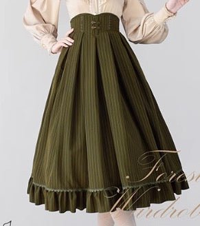 This set of a high-waisted skirt, vest, and high-neck ribbon blouse is a perfect tribute to the elegance of the Victorian era. The vest is exquisitely cut to create an elegant look that is both classic and modern. The high-neck ribbon blouse has delicate details that give it a modest yet elegant charm.