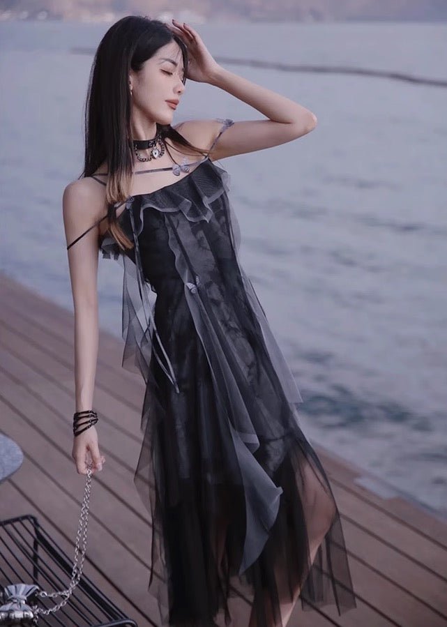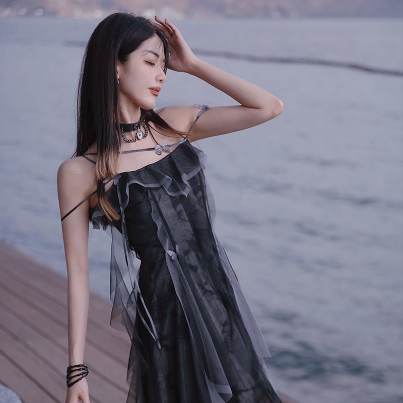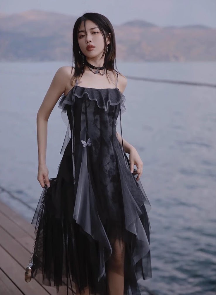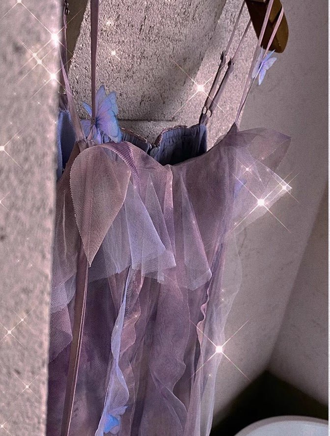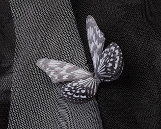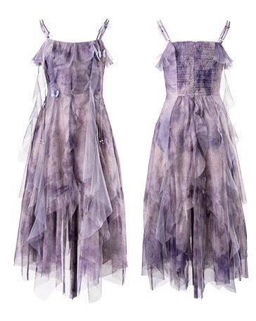 ムラ染め風のプリントの施されたチュールドレスは、蝶のポイントが施され美しく儚いイメージを纏うかのようなドレスで、夏の夜の夢のような一着です
